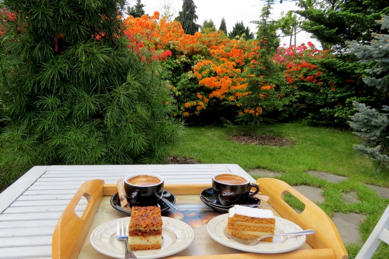 W tutejszym ogrodzie możemy podziwiać kwiaty w różnorodnych kształtach i kolorach.... Na widok otaczającego piękna, aparat fotograficzny był rozgrzany "do czerwoności". Zrobiłam mnóstwo zdjęć więc będę je sukcesywnie publikować... Gdy będzie ich przesyt, mam nadzieje, że dacie mi znać... Po zwiedzeniu prywatnego ogrodu poszliśmy do przytulnej kawiarenki "Pod kogucikiem". Wypiliśmy kawę na zewnątrz... Tutaj zawsze podają świetną kawę i przepyszne świeże ciasta... W ogrodzie pokazowym również kwitną azalie... Wczorajszy wyjazd był strzałem w dziesiątkę... Dzisiaj cały czas pada deszcz, jest bardzo zimno i nieprzyjemnie...