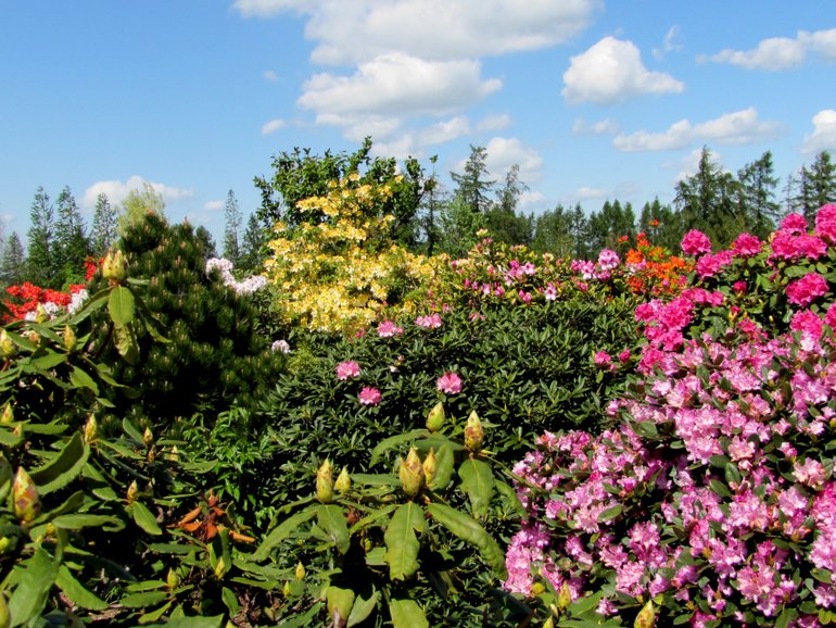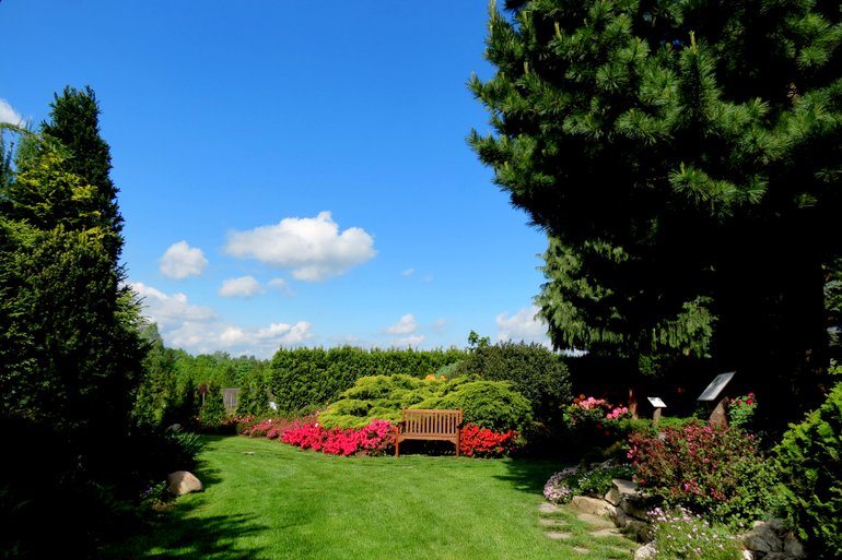 Już z daleka widać, że zbliżamy się do szkółki... Wzdłuż ogrodzenia rośnie kilkudziesięciometrowy żywopłot z azalii... Najpierw idziemy podziwiać prywatny ogród... A w nim mimo, że to pierwsza dekada maja kwitnące tulipany, magnolie i inne wiosenne kwiaty... Wśród bardzo ciekawej kolekcji iglaków i starych drzew błyskają trzy stawy... To one przyciągają setki żab... Z wielką przyjemnością słucha się ich koncertu... Co krok spotyka się zakątki pełne uroku i tajemniczości... Spacerując, cały czas podziwiamy wielkie skupiska azalii i różaneczników, i upajamy się ich zapachem...