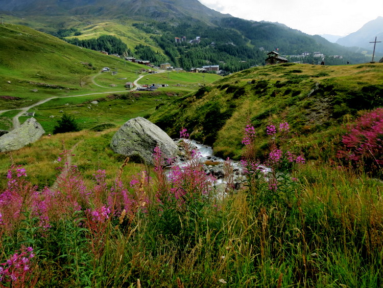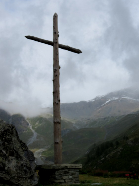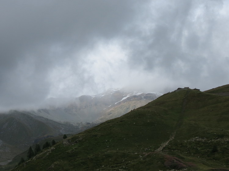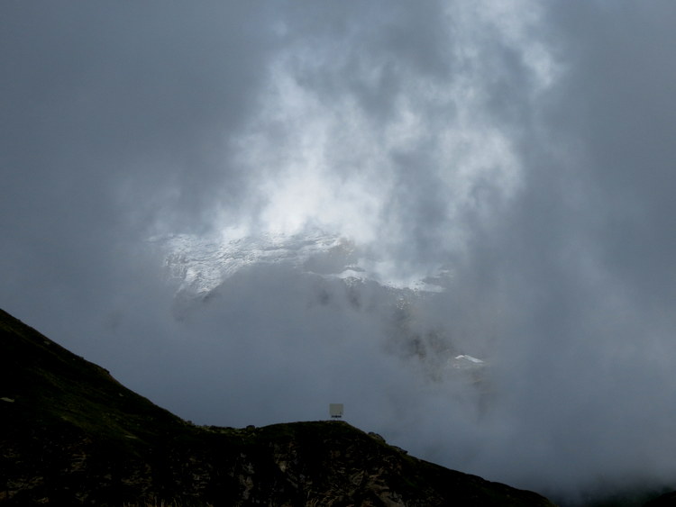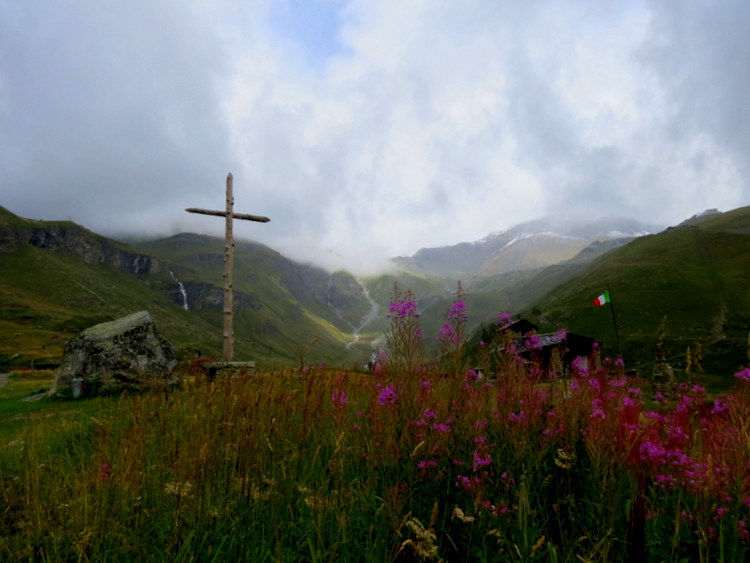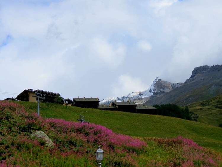 Stąd wyjeżdżałam kolejką linową na Mały Matterhorn by oglądać jeden z najbardziej znanych alpejskich szczytów Matterhorn... Niestety, oblodzenia i niebezpiecznie niska mgła uniemożliwiła zobaczenie czegokolwiek... Sprawdziło się tym razem znane powiedzenie: do trzech razy sztuka... Dolina i niższe partie Alp są widoczne, zaś szczyty spowite są chmurami... Jesteśmy trochę zawiedzeni bo znowu widoczność była kiepska... Mimo wszystko z Breuil Cervinia wyruszamy a szlak... Zaczyna padać gęsta mżawka...