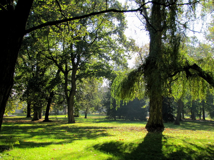 Jednak na widok zadbanego parku, ogromnych drzew, pomników przyrody, zbaczam z alejki... Nie widać jeszcze prawdziwej jesieni... Drzewa liściaste jeszcze w znakomitej, zielonej szacie... Jedynie w kilku miejscach, pod drzewami dostrzegam delikatną żółć, jasny pomarańcz i dojrzałą jesienną czerwień... Park jest rozległy, z pewnością kilkuhektarowy... To park krajobrazowy w stylu angielskim...