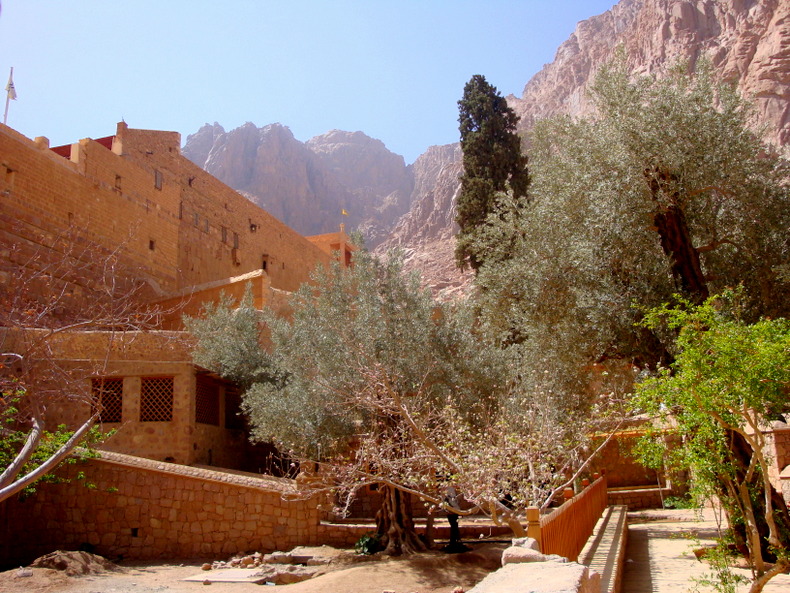 Busikiem jedziemy na parking w pobliże klasztoru świętej Katarzyny usytuowanego w surowym Wadi Deir... Dalej idziemy pieszo... Już z daleka ukazują się potężne, granitowe, wysokie na 10 - 15 m mury... Mam wrażenie, że to co widzę, to masywna twierdza... Mury muszą być potężne ze względów bezpieczeństwa bo klasztor jest jak maleńka wysepka na oceanie islamu... Mijamy miniaturowy gaik oliwny i bujne klasztorne ogrody z brzoskwiniami, palmami... To dzięki wodzie pochodzącej ze studni głębinowej są takie piękne...