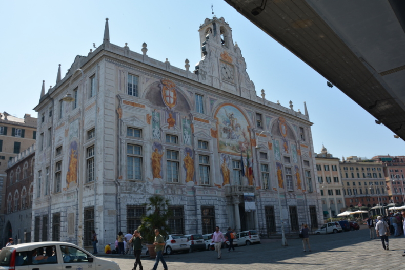 W niewielkiej odległości od brzegu i Starego Portu jest Palazzo San Giorgio... Urzekła mnie piękna budowla, pierwszy publiczny budynek w Genui... Zbudowany w 1260 roku w stylu gotyckim, przebudowany w stylu renesansowym... Fasada pokryta kolorowymi freskami... Przykuwa moją uwagę i budzi podziw... W centralnym miejscu, Święty Jerzy na koniu zabijający smoka... W "fałszywych" niszach sześć postaci historycznych; Caffaro - krzyżowiec, Andrea Doria - genueński admirał, doża z Genui, założyciel Republiki Genui, Krzysztof Kolumb, oraz Zaccaria - dyplomata, polityk... Ozdobą fasady jest popiersie Janusa, najstarszego rzymskiego bóstwa rzymskiego... Zazwyczaj przedstawiany jest z dwoma twarzami, ponieważ Bóg może patrzeć w przeszłość i przyszłość... Powyżej, godło Genui... Po przeciwnej stronie popiersie Neptuna, rzymskiego boga mórz... Wyżej, w tarczy herbowej - Libertas... Zwieńczeniem fasady jest wieża zegarowa... Pałac w pewnym okresie został zamieniony na więzienie... To właśnie tutaj w niewoli przebywał Marco Polo po przegranej bitwie morskiej między Wenecją a Genuą... "Dla zabicia czasu" snuje swe opowieści... Jego wspomnienia zostały spisane przez Rustichellego z Pizy, pod nazwą "Opisanie świata".