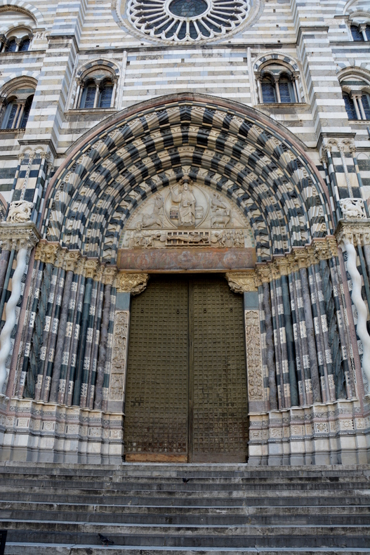 Perłę architektury gotyckiej mamy na wyciągnięcie reki... Fasada w biało-czarne marmurowe pasy... W średniowieczu symbol szlachetności... Na przednim planie dwie dzwonnice... Jedna z wież niedokończona, druga o wysokości około 60 metrów... Niemal całą szerokość fasady zajmują trzy portale romańsko-gotyckie z XII wieku, z czego środkowy jest najszerszy... Centralny portal, otoczony jest skręconymi, wyżłobionymi kolumnami i zwieńczony przeplatającymi się czarnymi i białymi pasami... W tympanonie, Chrystus ukazany jako władca na tronie... U stóp Chrystusa modli się rozciągnięty na ruszcie św. Wawrzyniec (San Lorenzo), patron katedry... Kamienna płaskorzeźba jest w stylu bizantyjskim... Nad centralnym portalem rozeta w stylu późnego gotyku francuskiego... Rozeta przeszklona witrażem z kamiennymi elementami...