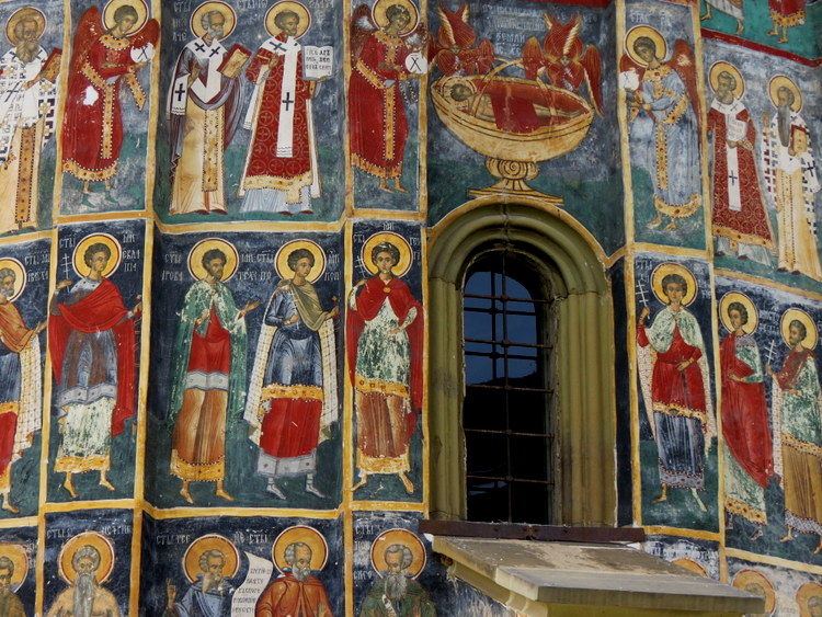 Autorami tej godnej podziwu dekoracji malarskiej są bracia Safronie i Ioan... Bardzo umiejętnie wykonali powierzone im dzieło... Tworzą spójną pod względem przekazu i formy całość...Gdy obchodziłam cerkiew dookoła, urzekły mnie szczegóły scen. religijnych... Najsłynniejsze dzieło monastyru znajduje się na ścianie północnej i przedstawia Drabinę do nieba tzw. drabinę Jakubową... Symbolicznie przedstawia: zalety, drobne uczynki, cnoty, które prowadzą na najwyższy poziom gdzie czeka Starzec - Sędzia Sprawiedliwy... Jest ciekawy fryz proroków, filozofów starożytności... Bracia Safronie namalowali pełny cykl życia św. Mikołaja, św. Jerzego Męczennika...