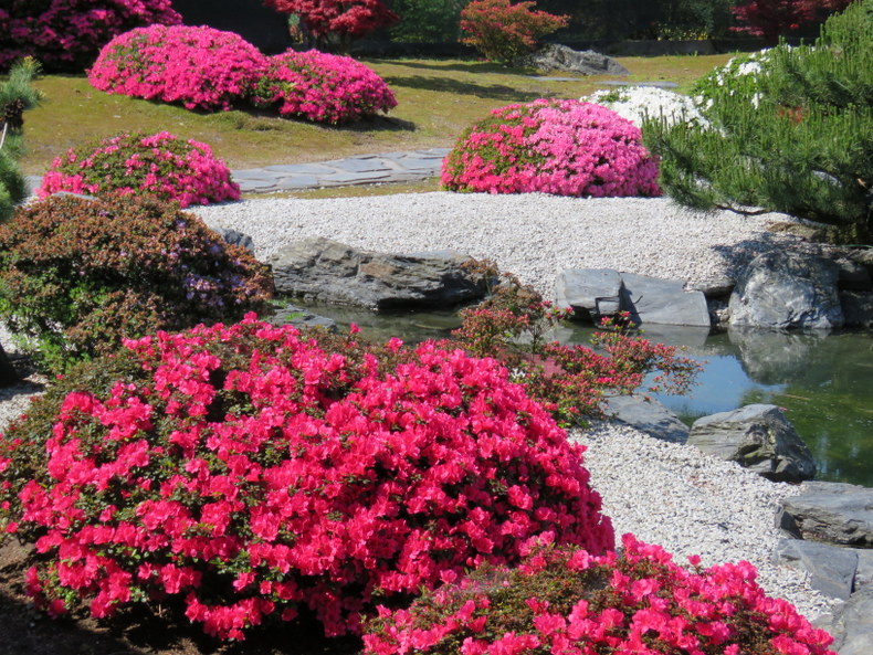 Nieodzownym elementem w ogrodzie japońskim jest woda, która daje życie i ruch... Jest tutaj oczko wodne z zasilającym je wodospadem... Wokół zbiornika ułożono bardzo wygodne, kamienne ścieżki... Od strony południowej jest duży zbiornik wodny o nieregularnym kształcie, który symbolizuje brzegi mórz... Na jego środku są dwie niewielkie wysepki... W wielu miejscach rosną zwarte kępy azalii; Maruschka, Schneeperle, Kermesina Alba i Rose... Na terenie ogrodu rosną klony japońskie, rododendrony, formowane sosny, wiśnie japońskie...