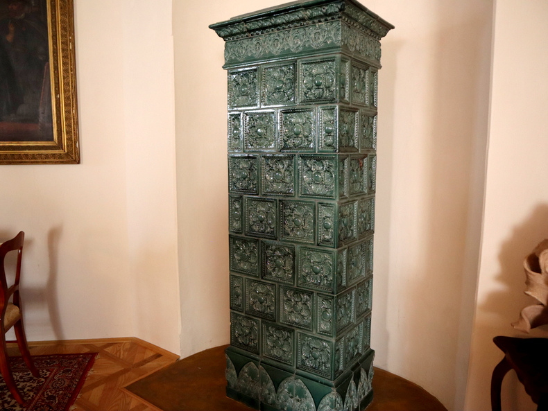 W Letniej Jadalni kolejny raz podziwiam przepiękną, czeską porcelanę z początku XIX wieku... Na ścianach obrazy, stół neobarokowy, krzesła w stylu biedermaier z XIX wieku i wspaniały piec kaflowy, jedyny jaki w zamku ocalał...