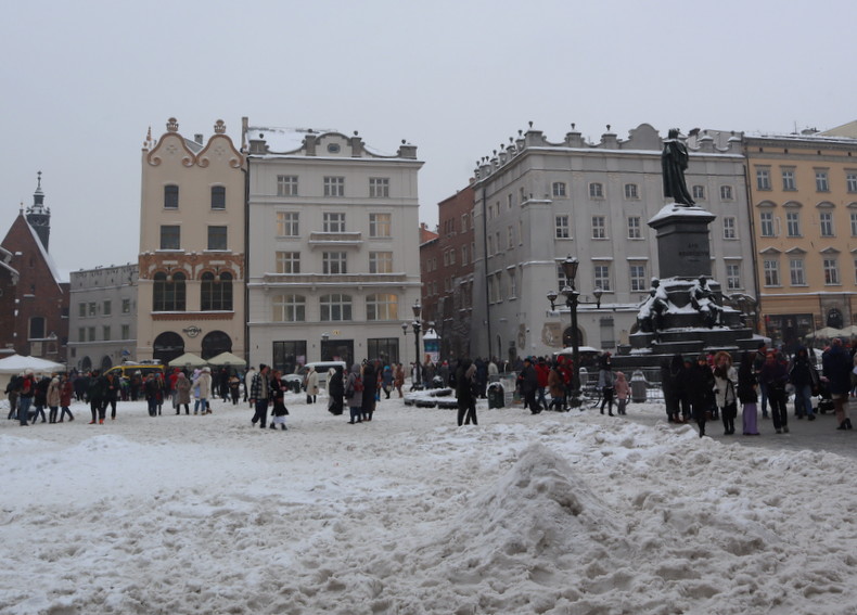 Szłam Floriańską... Poniekąd była odśnieżona ale poruszanie się wymagało dużej sprawności i cierpliwości... Chwilami nogi mi się tak rozjeżdżały, że byłam bliska szpagatu... Powoli dotarłam do Rynku... Jego widok nie zachwycał... Wszędzie dużo śniegu, nawet pomnik Adama Mickiewicza był nim przykryty... Całkowite zaskoczenie... Nigdzie nie zauważyłam szopek krakowskich... Udałam się do Pałacu Krzysztofory... Dopiero tam dowiedziałam się, że i tym razem tradycji stanie się zadość ale szopki muszą się schronić przed mokrym śniegiem pod arkadami Sukiennic...