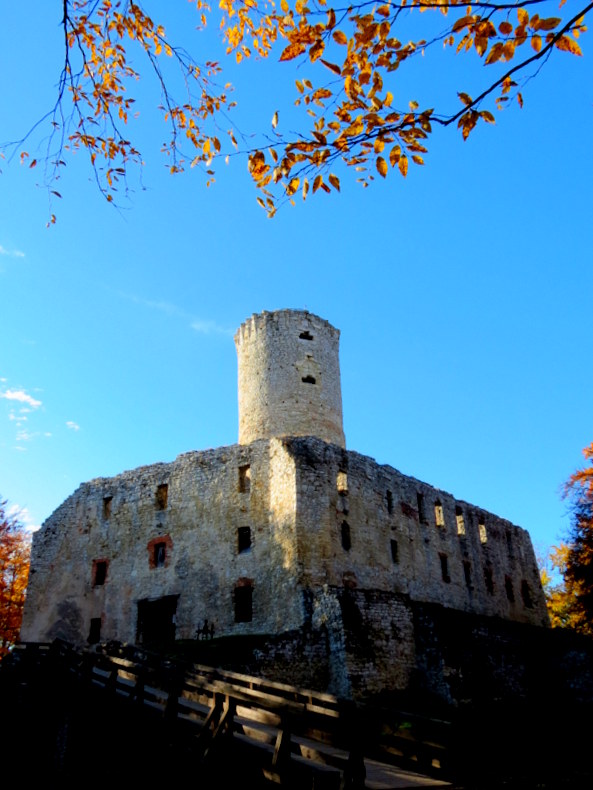 Między drzewami prześwituje zamek z kamienia, który zaczęto wznosić w drugiej połowie XIII wieku...  Warownia posiada cylindryczną, wysoką wieżę... Zależnie od potrzeb i przeznaczenia zamek był kilkakrotnie przebudowywany... W końcu pełnił funkcję więzienia dla duchownych... Wiele pomieszczeń zostało zaadaptowane na więzienne cele... Więziono tutaj nie tylko innowierców, ale także duchownych, za przestępstwa pospolite i wykroczenia przeciw kościołowi... Od XIX wieku zamek zaczął popadać w ruinę... W latach 50 -tych XX wieku zaczęto go odbudowywać i obecnie należy do najlepiej zabezpieczonych ruin w Polsce...