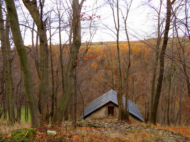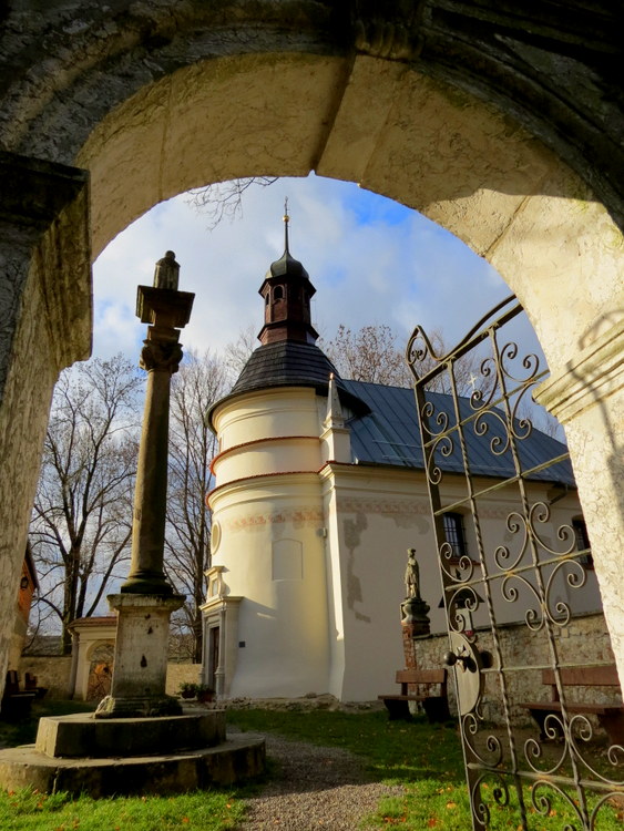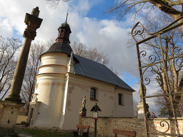 Zatrzymujemy się na niewielkim parkingu... Idziemy do miejsca rzadko odwiedzanego być może nawet mało znanego ale niezwykle uroczego... Czerwony szlak prowadzi na dosyć strome wapienne skały... Od strony zachodniej i północnej zbocze porośnięte jest wysokimi drzewami i krzewami... Wśród gołych gałązek dostrzegam czerwone owoce... Na tle szarości  wyglądają cudownie ... Jest i szczyt skałek... Znajduje się tutaj maleńki, barokowy kościółek p.w. Wniebowzięcia NMP i bł. Salomei... Teren przykościelny jest ogrodzony kamiennym, wysokim murem...