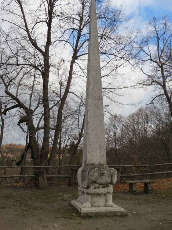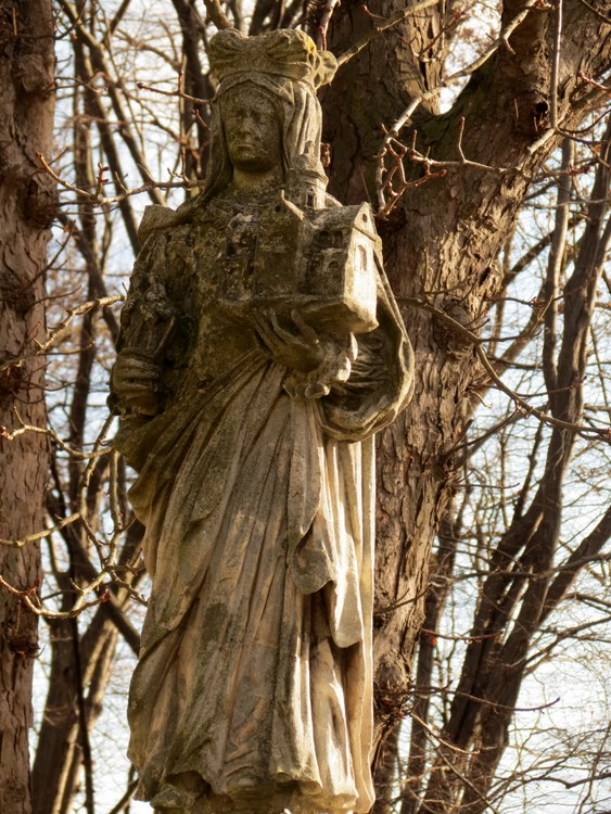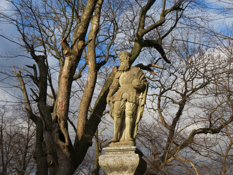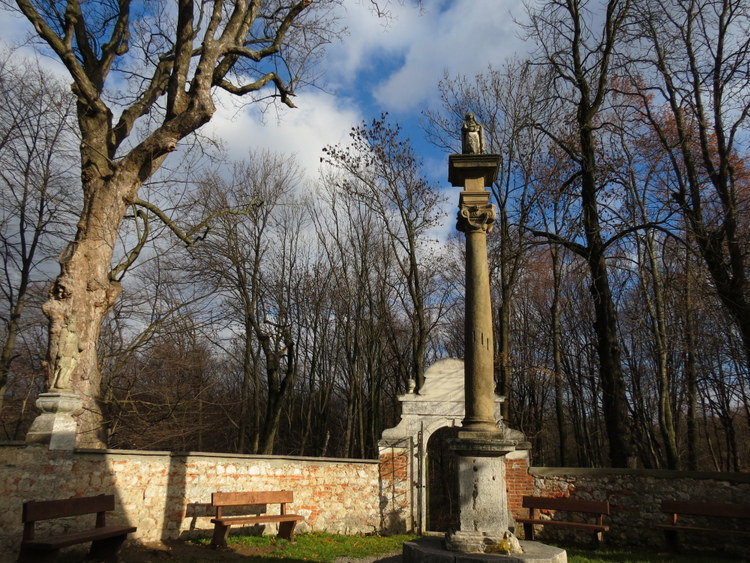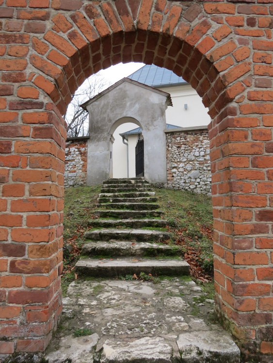 Wchodzę przez główną bramę... Na murze umieszczono pięć posągów; Bolesława Wstydliwego, Henryka Brodatego, Kunegundę, Kolomana Węgierskiego i Jadwigę Trzebnicką.... Na kolumnie, figura świętej Klary... Jestem zaskoczona... Maleńka świątynia jest po renowacji... Obchodzę  ją dookoła... Tutaj, na szczycie wieje lodowaty wiatr... Jest strasznie zimno i marzną nam ręce... Krótkie spojrzenie na malowniczo wyglądającą Dolinę Prądnika...  Na zboczu, pustelnia bł. Salomei... Jest zamknięta... Uwagę moją przykuwa wysoki, granitowy obelisk... Ustawiony  na grzbiecie słonia... Bardzo stary, pochodzi z 1686 roku... Postawiono go trzy lata po zwycięstwie Jana III Sobieskiego pod Wiedniem... Obelisk wzorowany na rzymskim, stojącym przed Santa Maria Sopra Minerwa... Będę szczera... Nasz jest piękniejszy...