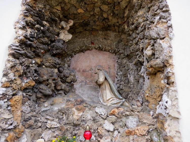 Jeszcze  spojrzenie  na  wnętrze  kościółka... Na  szczęście  jest  otwarty... Wnętrze  skromne,  jasne... Ołtarz  główny  wykonany  z  marmuru,  wypełnia  całą  ścianę  prezbiterium... W  centralnej  części  obraz  Matki  Bożej  z  Dzieciątkiem... Po  lewej  i  prawej  stronie  niewielkie  ołtarze  z  białego  marmuru...