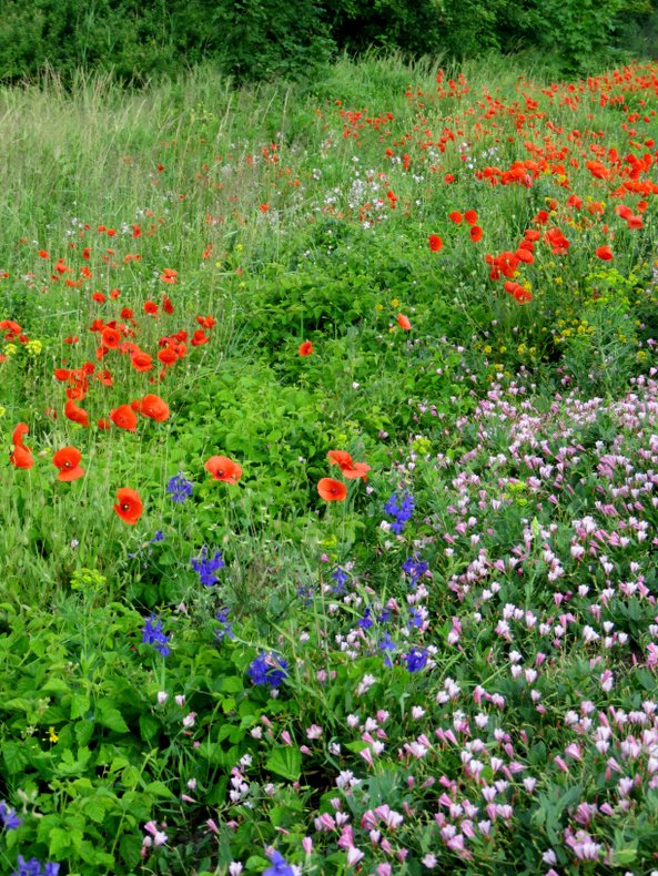 Przez ostatnie trzy lata, ta część łąki trochę później była koszona... Dzięki temu wysiewały się nasiona i teraz mogę oglądać kwitnące maki, wśród nich rosnące goryczki i ostróżeczki polne i inne dzikie kwiaty... Stałam oszołomiona wśród czerwonego kwiecia... Patrzyłam z zachwytem jak chwieją się te polne, pospolite, bardzo piękne maki...