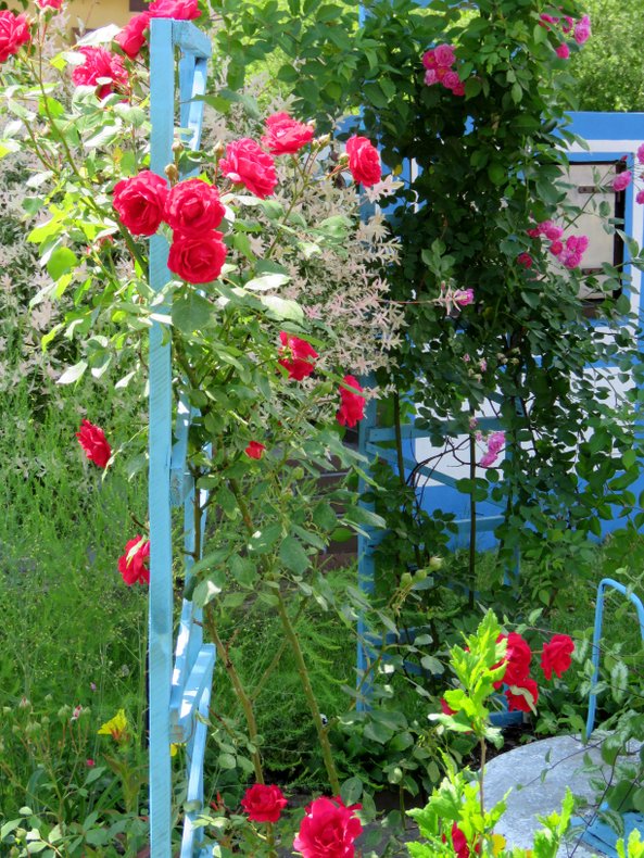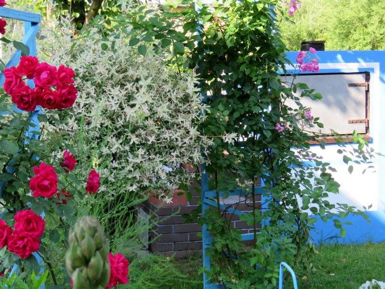 Muszę się do czegoś przyznać... Ja, tradycjonalistka poszłam na żywioł... Pod wpływem pobytu w Grecji, jeden zakątek ogrodu, tam gdzie jest wędzarnia z grillem zapanowały niebieskości... Dobrze, że w tę część ogrodu, rzadko ktoś zagląda... Może faktycznie przesadziłam z tym kolorem?